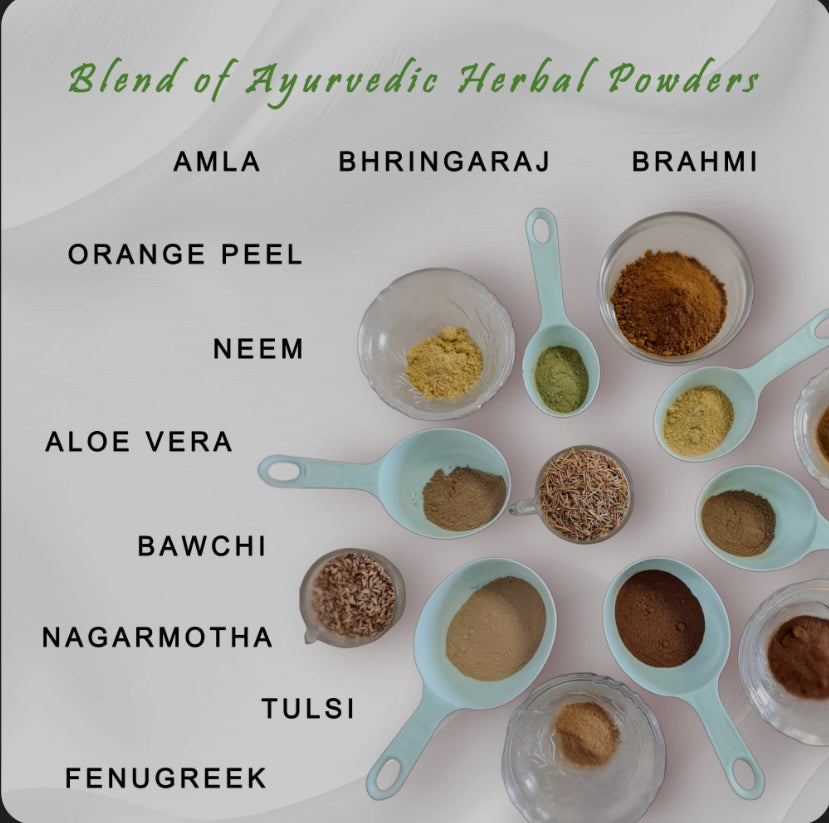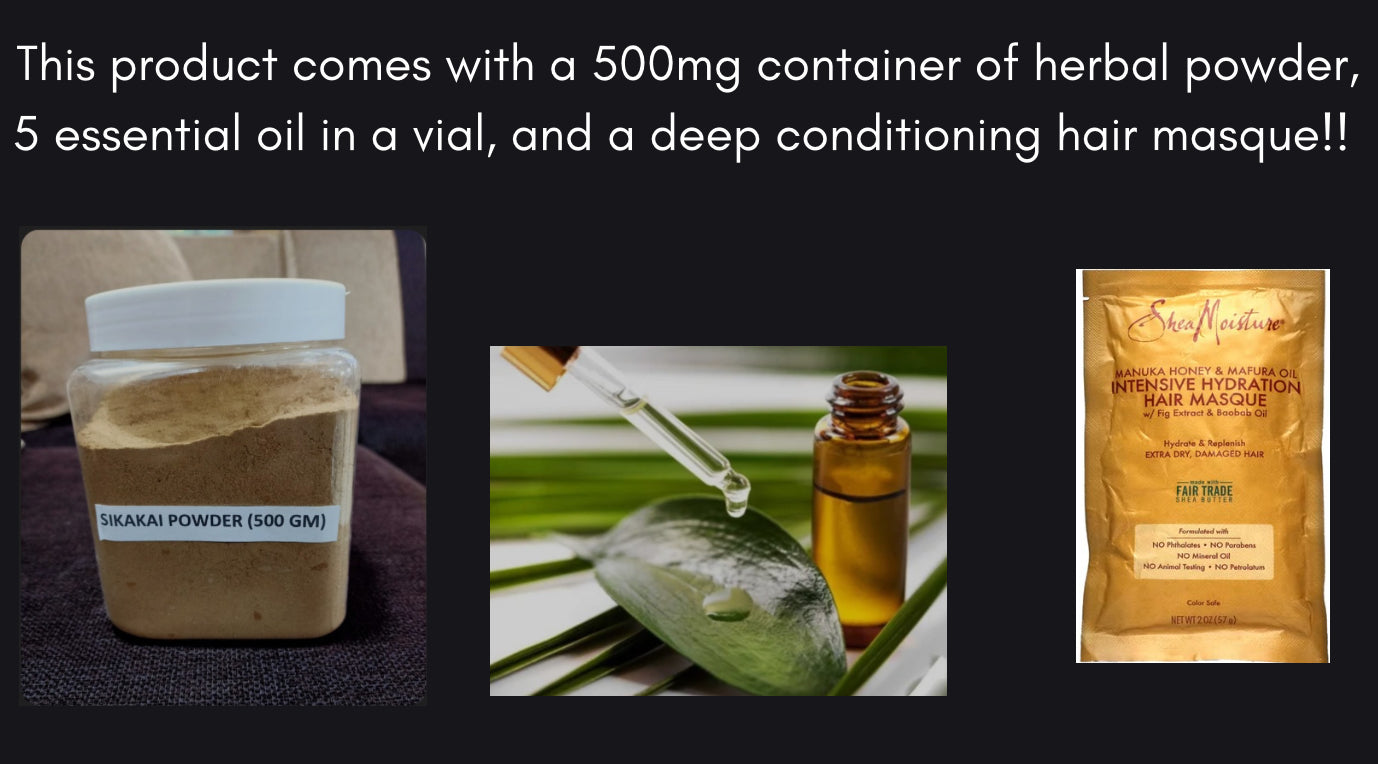 This handcrafted blend of powdered herbs has a base of shikakai powder which has 12 potent herbs that have anti fungal/antibacterial properties as well as reduces hair loss, thickens the hair shaft, adds exceptional shine, darkens gray hairs naturally with indigo. On top of those 12 potent herbs I’ve also added amla, brahmi and few other secret herbs I can’t share 🤫🤪for deep conditioning properties so this 2-1 shampoo and conditioner is packed with both cleansing and hydration properties. And also comes with an oil vial meant to be mixed into your herbal powder.